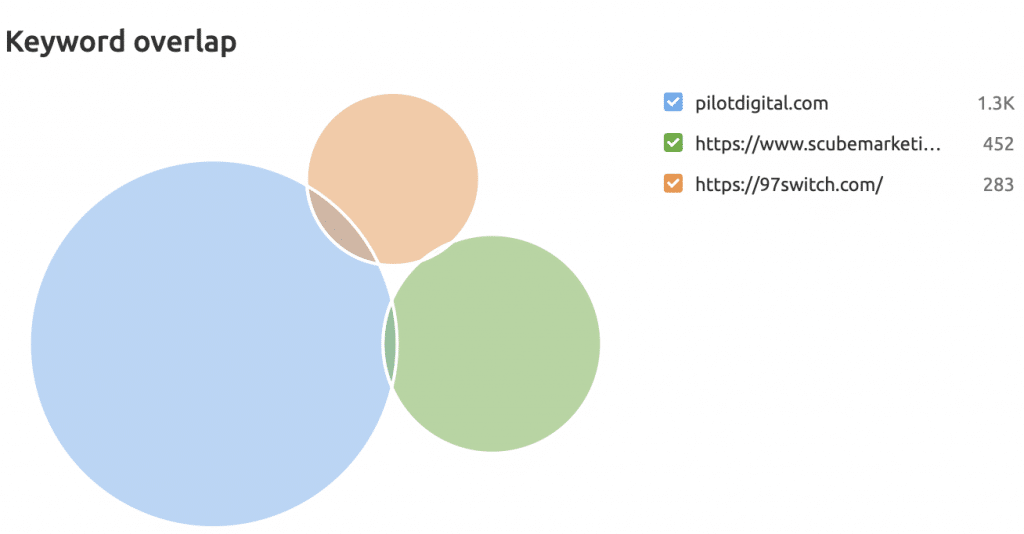 Using domain analysis tools will provide insight into what keywords your competitors are performing well with. From there, you can perform a more in-depth search to support your goals. Tools like SEMrush and Moz provide detailed breakdowns of competitor rankings. In SEMrush, the Competitive Research Toolkit Dashboard allows you to compare multiple domains.