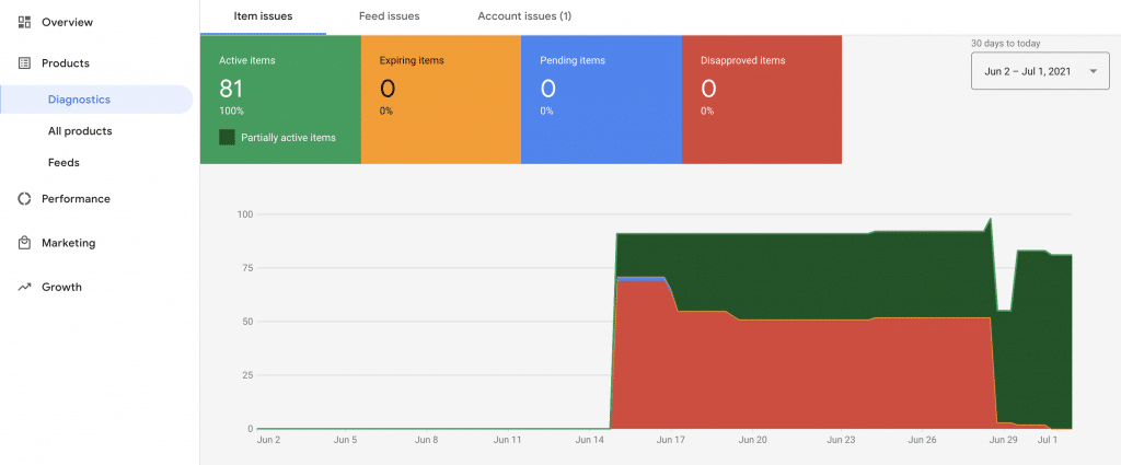 Once you’ve completed the setup within Shopify your products will automatically start syncing. Keep track of the status of your listings in the Diagnostics tab in Merchant Center.