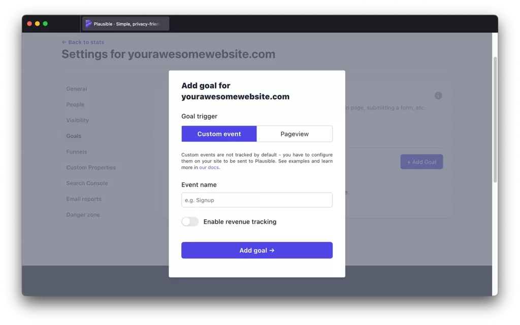 With your Gravity Forms now configured to append custom event labels as CSS classes, the next step is to define the event goal in Plausible (view more detailed instruction on Plausible):