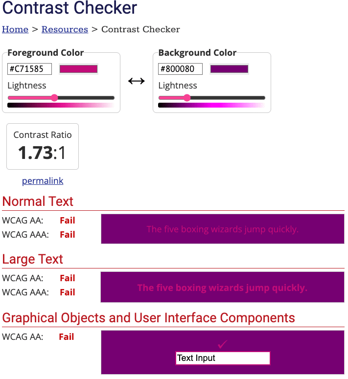 If we take one of the examples above and plug the hex values into a testing tool, we can toggle between colors to figure out a more accessible color combination for your website.