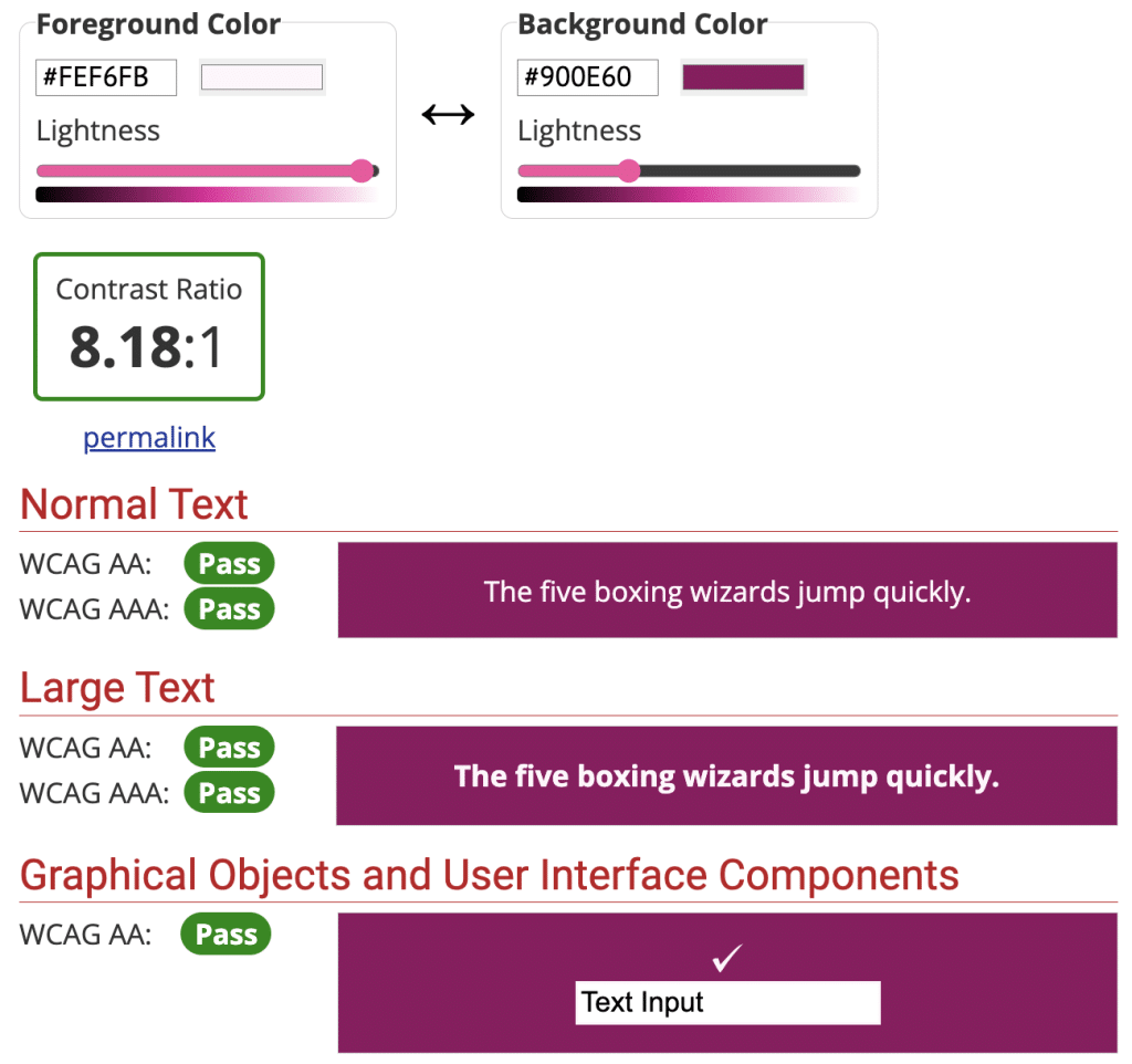 When we toggle the Foreground color to the right, we can see how at one point the color combination passes accessibility standards.