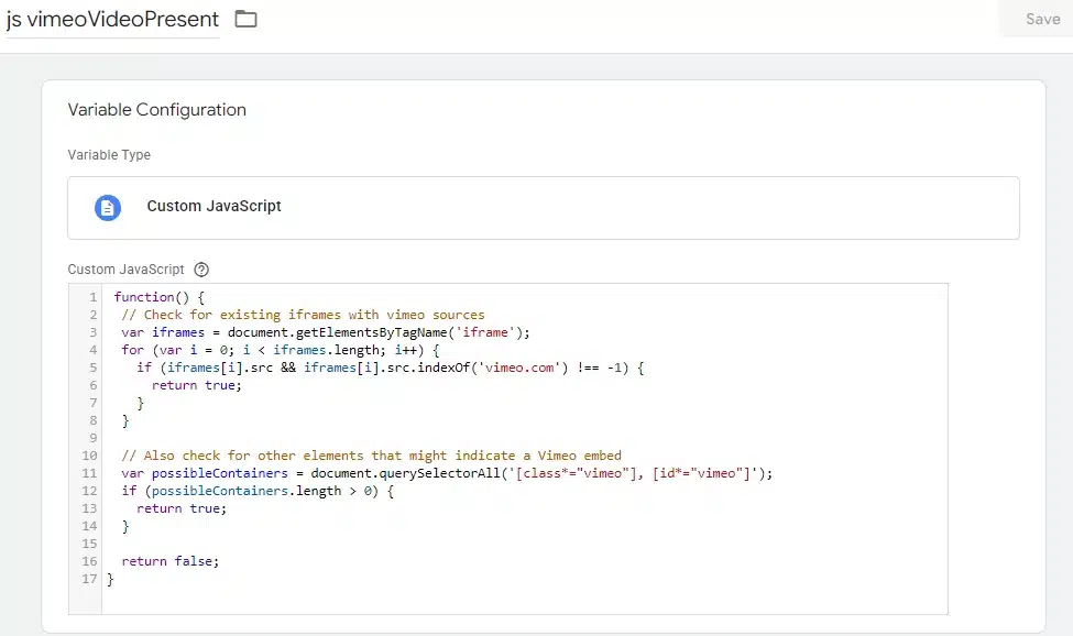 First, we’ll create a Custom JavaScript variable that checks if any Vimeo videos are present on the page.